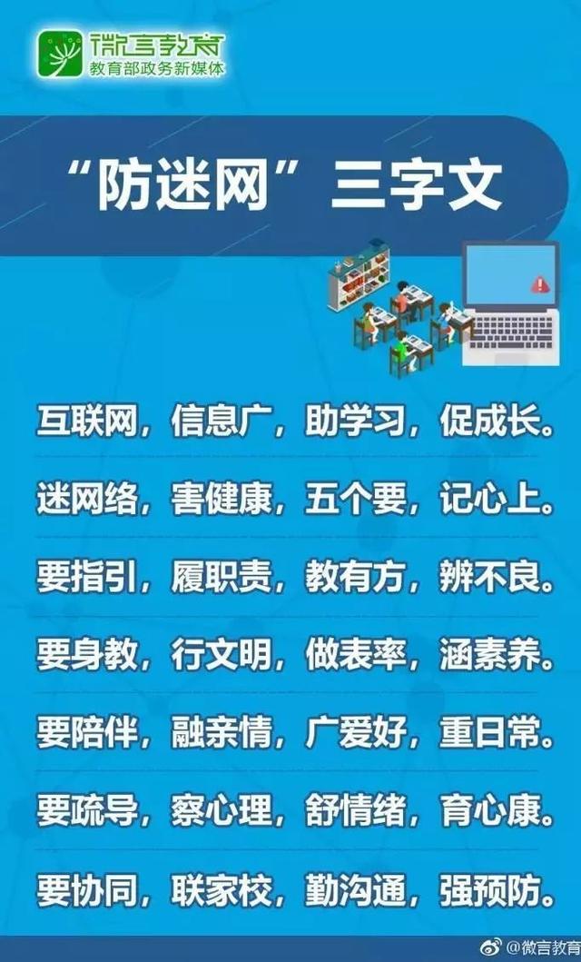 今年4月,教育部發出《致全國中小學生家長的一封信》,引導家長積極、快速行動起來,有效預防中小學生沉迷網絡。信中還有“防迷網”三字文,朗朗上口,便于記憶。一起學習↓↓↓