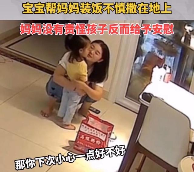 我在網(wǎng)上看到一個(gè)寶寶,她想幫媽媽把飯盒裝到袋子里,卻在拿的時(shí)候,不小心把飯盒打翻了。媽媽過(guò)來(lái)后看到撒了一地的飯菜,卻沒有發(fā)脾氣,只是溫柔地抱著女兒說(shuō):
